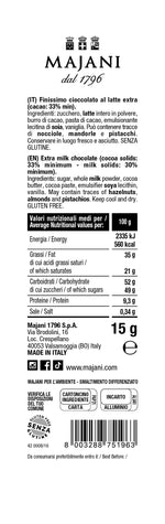 Chocolat au lait extra (sucre, LAIT entier en poudre, beurre de cacao, pâte de cacao, émulsifiant : lécithine de SOJA, vanille). Peut contenir des NOISETTES, AMANDES et PISTACHES. SANS GLUTEN.